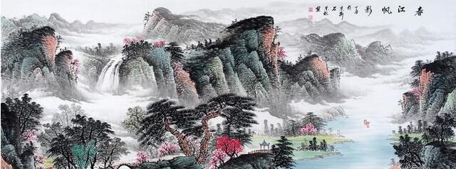 同样是描绘春季的景色,而这幅八尺《春江帆影》是设色山水,画中的山峰众多,绵延万里,十分雄壮,山间植被茂盛,多用焦墨描绘植物,生机勃勃,而且用红色的桃花盛开,展现了春季充满灵气;山间瀑布飞流直下,下方河流宽阔用绿色描绘,绿水宁静,一只小船缓缓向前有一番风顺的含义,寓意美好十分经典!