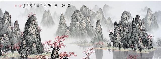 而不同的山峰上有许多红色的乌桕树点缀,并且没有描绘的非常茂密,每棵乌桕树都是只有很少的枝丫,乌桕树叶用红色描绘,不重,但却经霜红透林稍,和周围的景色相比更加的鲜艳,仿佛在绿叶中的红花一般显眼,展现了独特的色彩。这幅《漓江秋韵》描绘的漓江景色淡雅别致富有韵味,红色点缀更显空灵美景,艺术价值高!