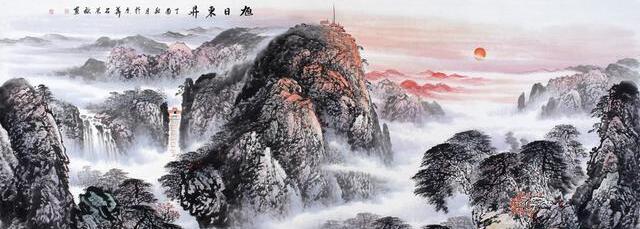 这幅八尺横幅的山水画泰山《旭日东升》开阔大气,用平视的角度描绘了雄伟开阔的景色,高山雄伟壮阔与天相接展现山之高大,同时山顶被红日所映照,以红色描绘展现山之美景;同时近处山间松林众多,用焦墨描绘,生机勃勃,而山间瀑布飞流直下,和着云雾意境深远,非常经典。这幅《旭日东升》描绘了泰山雄伟壮阔的自然山水景色,红日高升寓意美好!