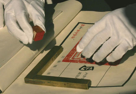 钤印,篆刻家的述语,通俗的讲法是:盖印,印印章。