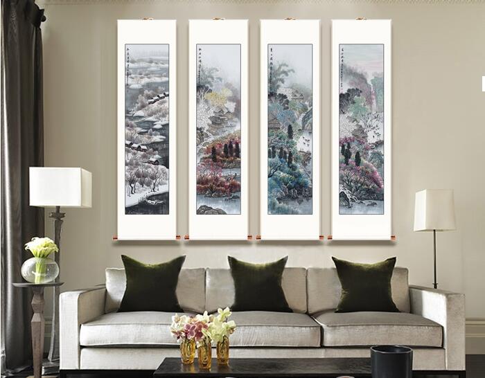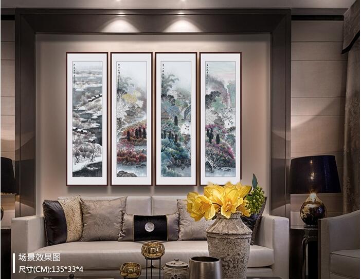 书画艺术自诞生以来,便以其博大精深的艺术魅力,濡染着一代代向往吉祥美好的人们。作为古老书画艺术重要的体现形式之一,四条屏更以其独特的艺术内涵代表着中国的传统文化。四条屏以“四”为数,“四”在中国传统文化中含义丰富,譬如四季、四时、四方、四海、四德等均与之相关,寓意着四通八达,四平八稳,四海升平。无论是在古代还是现代,“山水四条屏”和“四季四条屏”均最受名家钟爱。春夏秋冬皆美景,国画“春夏秋冬”四季条屏以大气磅礴的艺术笔法,展现四季山水的灵秀俊美。