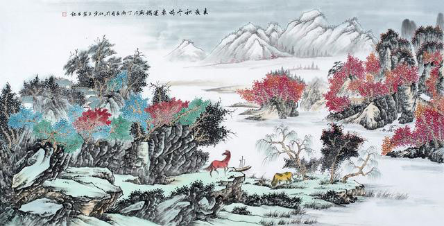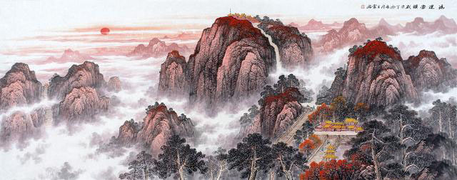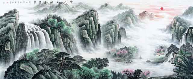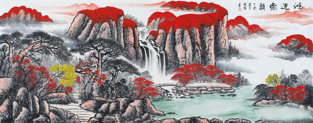 蒋伟先生的聚宝盆山水画,在风水地理风水格局之中,讲究的是左青龙、右白虎、前朱雀、后玄武,具体的格局为:背倚玄武——主山,是连绵起伏的群山,也就是所谓龙脉;两侧有重重山脉相拱卫,即“青龙”“白虎”;前有朱雀——前有开阔水面,河水蜿蜒而绕过,预示着财运滚滚,源远流长。这幅红色的聚宝盆山水画还是很好客厅风水字画。