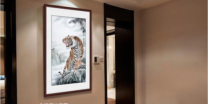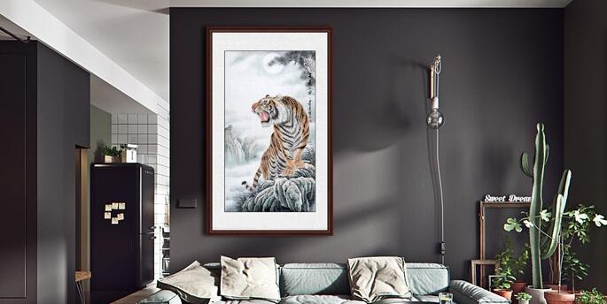 家中挂老虎图是一种吉祥好运的象征。上山虎一般都是昂首挺胸的姿势,配着松树枝、雪景,宁静致远的感觉给人一种步步登高之感,在家中挂幅上山虎寓意着事业上步步高升,事事如意,招财纳福。