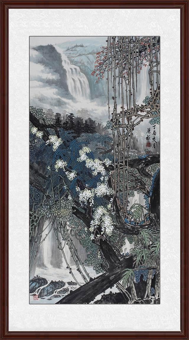 四尺竖幅国画《幽谷溪鸣》描绘的自然山水不多,但是很有层次感,颇有南宋马远以一角山水展现天地美景的感觉,艺术而有韵味。这幅画中近处是繁茂的树干、鲜花、藤蔓,并没有简单勾勒留出空白,相反用极为稠密的笔法描绘这些植物,三者之间相互交错、密密麻麻,但是却一点不杂乱,白色的花朵在最外面,然后是焦墨描绘的树干和用青绿色彩渲染的树叶,其中有穿插着许多藤蔓,展现了植被的生命力、画家细致的笔触和绘画功底。而作为背景的远山、瀑布等景色用淡笔勾勒描绘,衬托了近处景色的细致,十分经典。