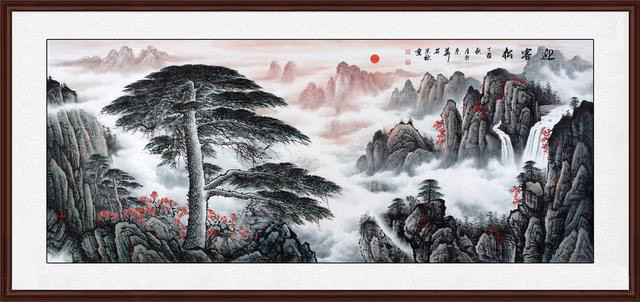 石荣禄老师的八尺《迎客松》更加婉约,重视整体的塑造,画中的松树挺拔,上接天下接地,松针繁茂枝桠众多,下方红色的植被生机勃勃,衬托更美;湖中的山石描绘细致,山石字太多,用重墨描绘连接处,展现阴影之态,山顶细密的松树展现顽强的生命力,富有生机,山间瀑布、云海更加的温婉,是衬托连接之物,展现了美丽的姿态!这幅八尺《迎客松》描绘了富有色彩而温馨的黄山美景!