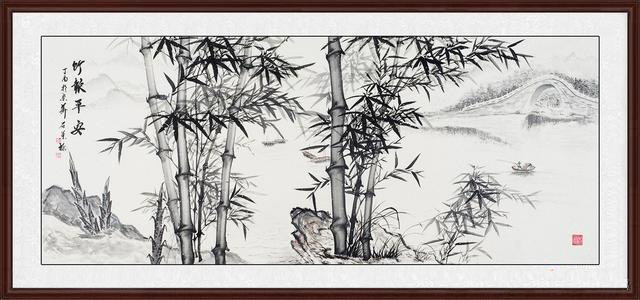 六尺横幅的水墨写意竹子山水画作品,整幅画以水墨为主,没有设色渲染,用细笔、水墨勾勒描绘,用笔极简,有“减笔画”的风采。画中竹子挺拔笔直,自下而上贯穿整幅画,展现了竹子挺拔茂盛的姿态,两处不同姿态的竹子各有其区别,展现姿态也不同,同时湖面静谧,小船、渔翁、桥梁等景物描绘了水的不同意向,描绘了自然风景的静谧。整幅画描绘了水墨竹子挺拔笔直的姿态,展现了竹子的高洁品味,经典雅致寓意非凡!