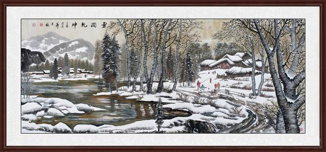 而道路旁则是许多调皮的小孩子在放各种鞭炮,姿态各不相同,十分真实,不禁想起自己小时候每年下雪也是这样调皮的在外面放鞭炮的,真是美好的回忆!这幅《雪润乾坤》描绘了冬季洁白无垠漫天雪景的美丽风光,充满童趣和喜悦的味道,展现了“瑞雪兆丰年”的美好祝福,艺术价值高!